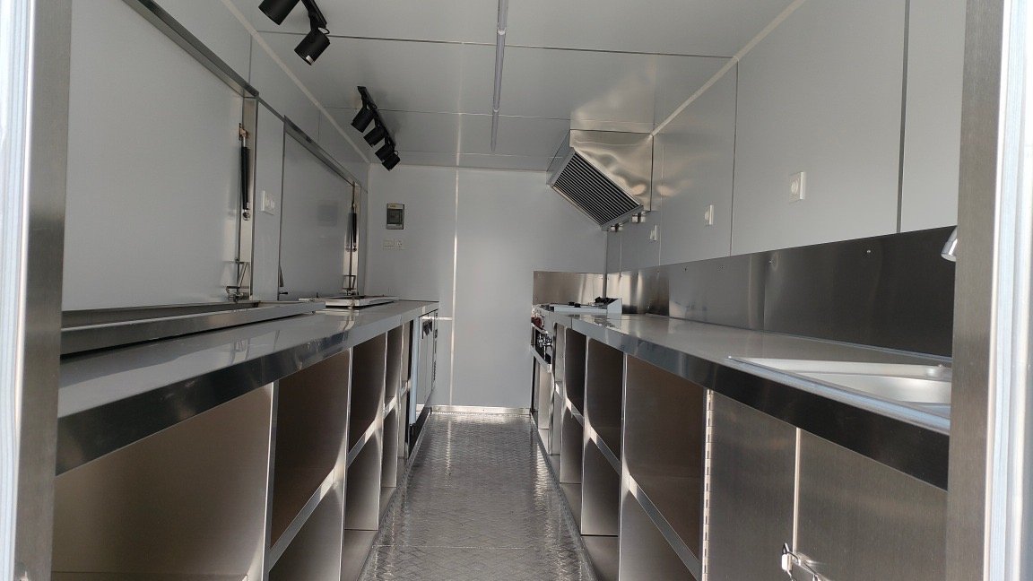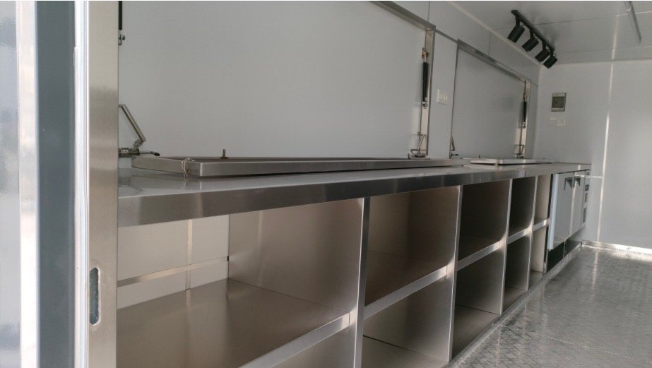 These 19ft size container bars accommodate 2-5 people. The base container bar includes electrical outlets, insulated walls, stainless steel countertop and shelves, non-slip aluminum floor, lights and NSF certified hot/cold 4 sink water system with water tanks. Several add-ons including cooking equipment and sliding concession windows are available. The dimensions of this container bar not including the roof patio are 19’L x 7.54’H x 7.22’W.